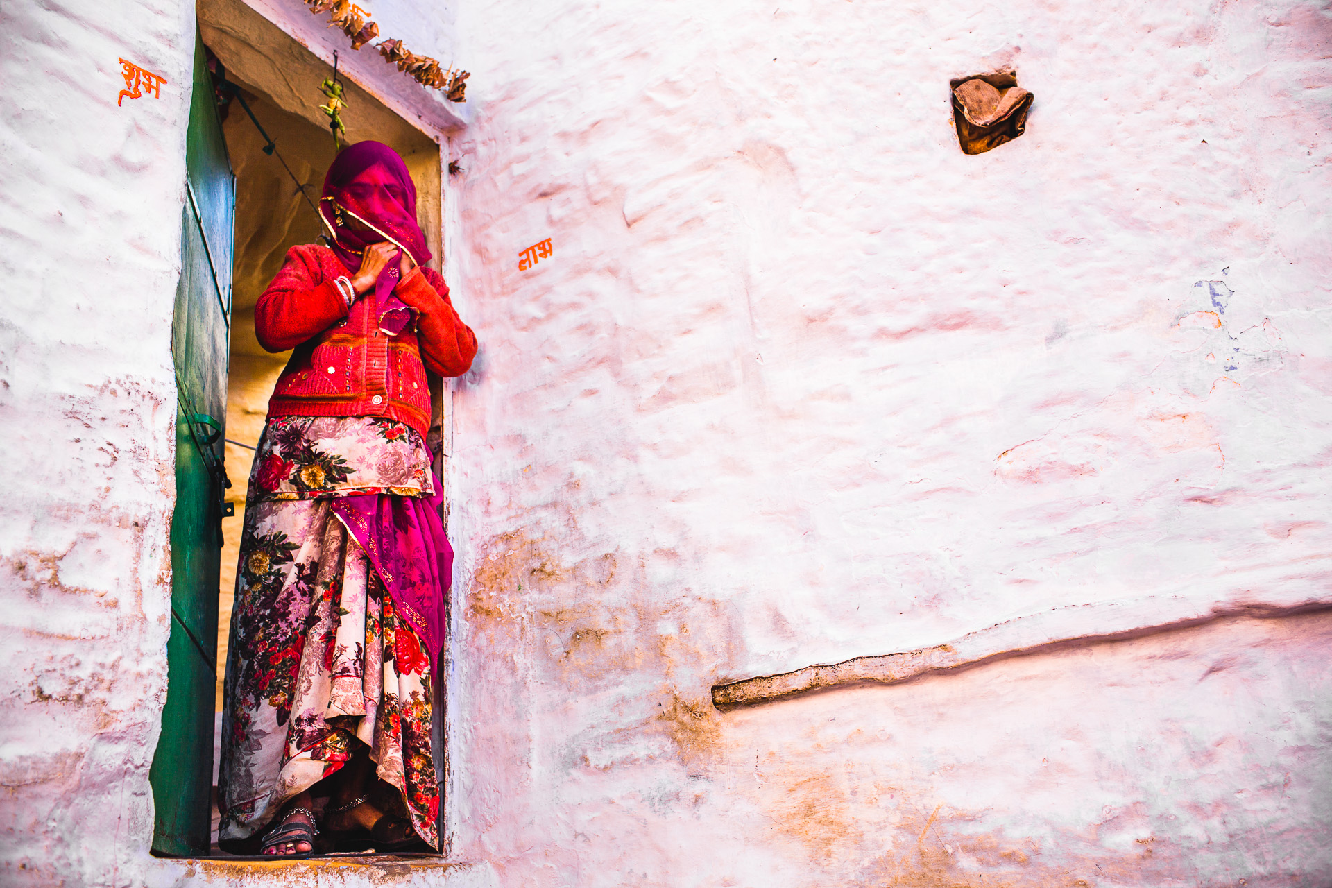 Under the veil. Of every person lies a world of memories, expectations and dreams. I'll never know what's behind the green door, I would expect a warm home for a family. Still I'll never know what her dreams are about, what life made her going through, what it is to open the green door everyday. I'll never know the world under this woman purple veil. Jaisalmer, India, 2014.